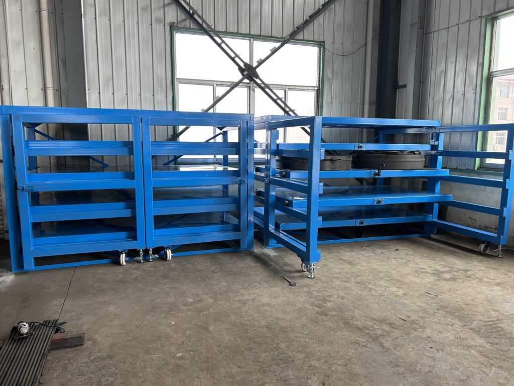 2023年4月6日山東青島手搖模具架安裝現(xiàn)場,貨架內(nèi)長3000mm,深度1500mm,4層手搖抽出;